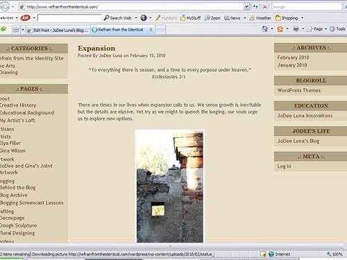 Often the new requires adjusting activities to make room for everything I want to do. For example, my “blogging identity quest” commitment to nightly postings proved to difficult to maintain because I was working simultaneously on the creativity site www.refrainfromtheidentical.com. So, now I am learning to divide my time between the two blog sites.
