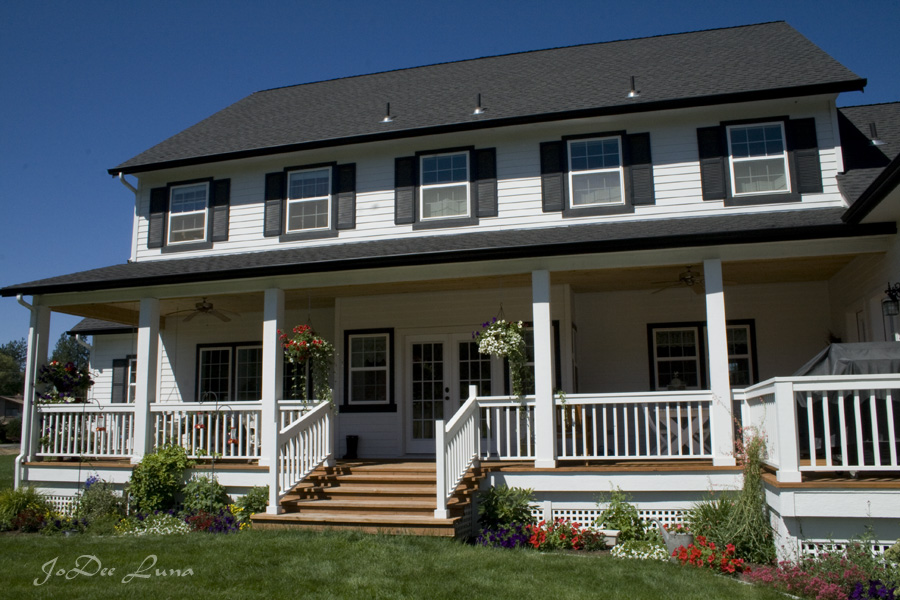 Indulge me as I take you into this magical land, like a Country Living magazine opened up and jumped into 3-D. This house is amazing, a modern country home with porches framing the front and the back.