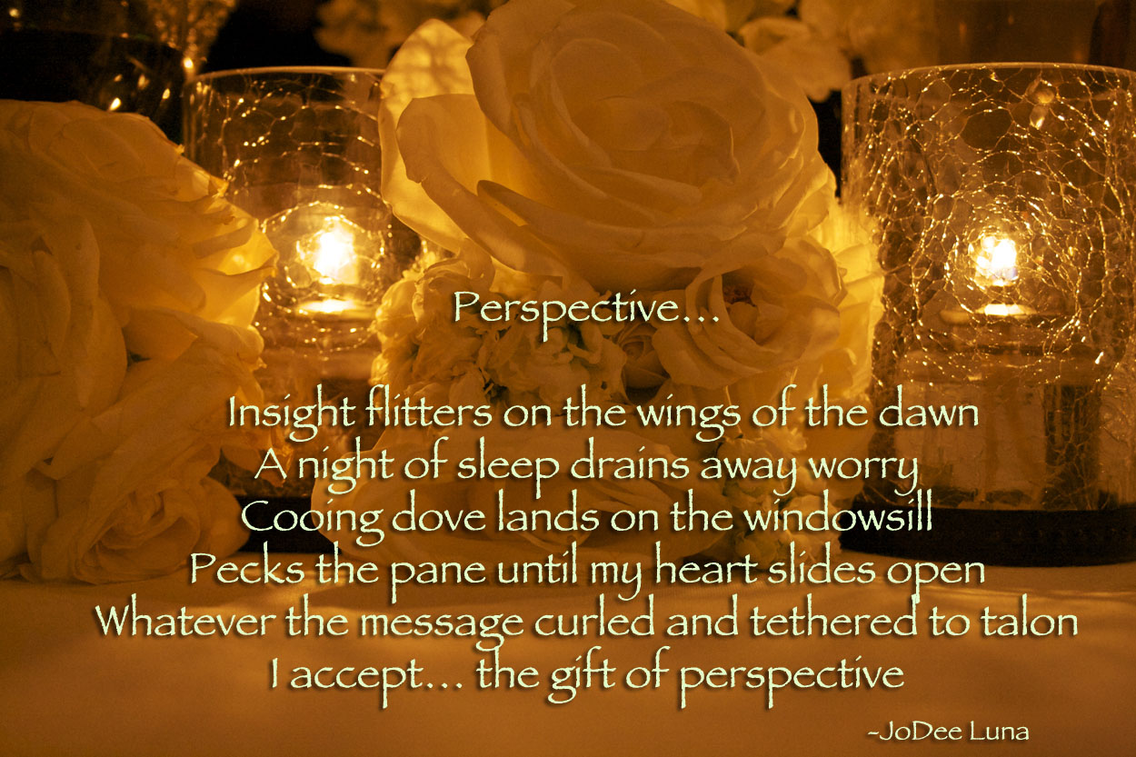 2. Profound words on perspective. I’ve had a lot of chances lately to change my perspective. You’d think I’d learn. Thanks for sharing… and thanks for linking my blog to yours!