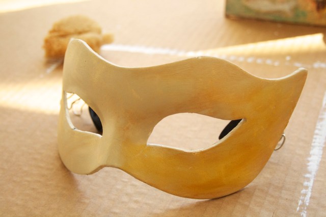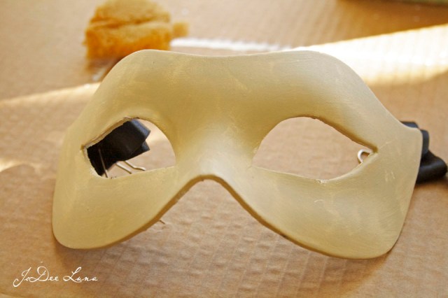 Step one: clip the ribbons out of the way and paint the mask Unbleached Titanium acrylic paint (Artist’s Loft)