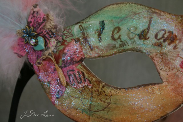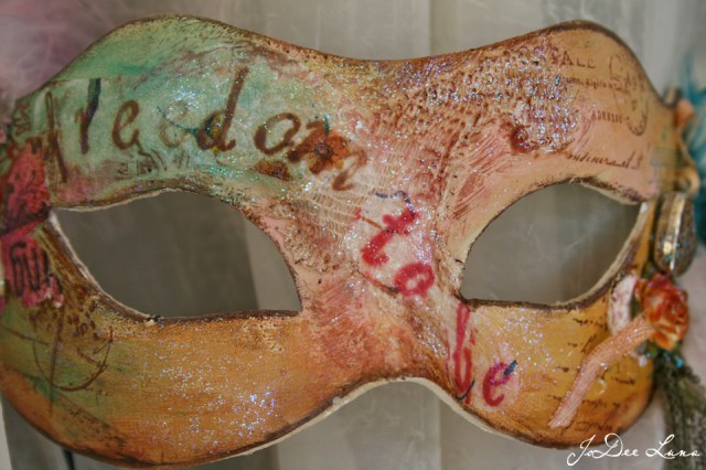 • Creating a vintage masquerade mask is a delightful way to spend a day. Each mask becomes a unique expression, depending upon the message and embellishments you use. Add to this, the enjoyment of taking photos of your mask. When you’re out shopping in art stores or garage sales, be on the lookout for embellishments for your masks. I collect odds and ends to add to my masks and other mixed media pieces.