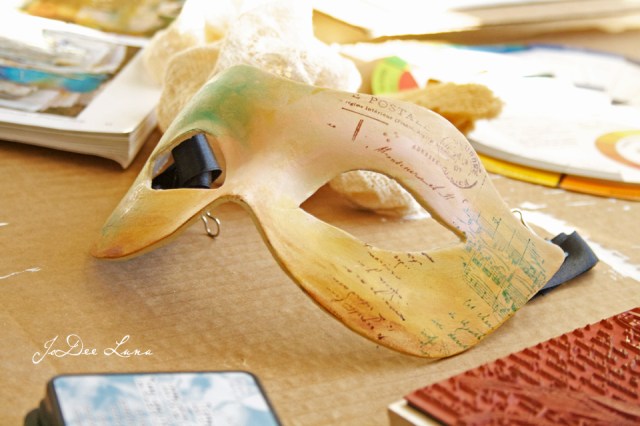 I’d envisioned a vintage mask for weeks. In fact, the concept captivated me because I love all things vintage—aged colors of yellow ochre and burnt sienna with a splash of aqua green; ink stamping and amber stones set in an antique heart. I could see the mask developing in my imagination.