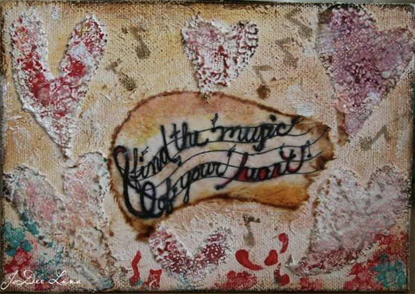 Lightly sponge acrylic paint over the hearts. Ink the words onto a piece of rice paper and antique using Tim Holtz inks. Use gel medium to attach the words to the canvas.