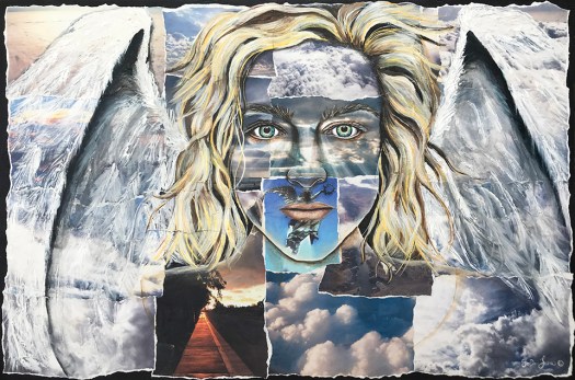 A dream of an angel that carried art canvases in his arms inspired this mixed media portrait.