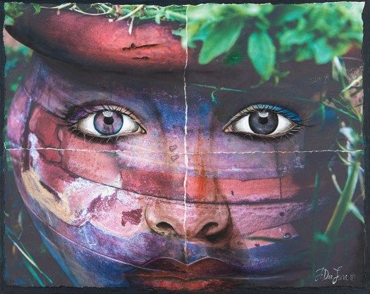 So I photographed the pot, printed out the paper, and used Golden Gel Medium to fix the images onto the canvas. Then I sketched eyes, a nose, and lips onto the paper and painted until she became a work of art on canvas.
