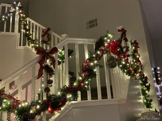 Our new home has some wonderful features that make decorating especially captivating. For instance, the dramatic staircase provided an opportunity to drape garland and lights.
