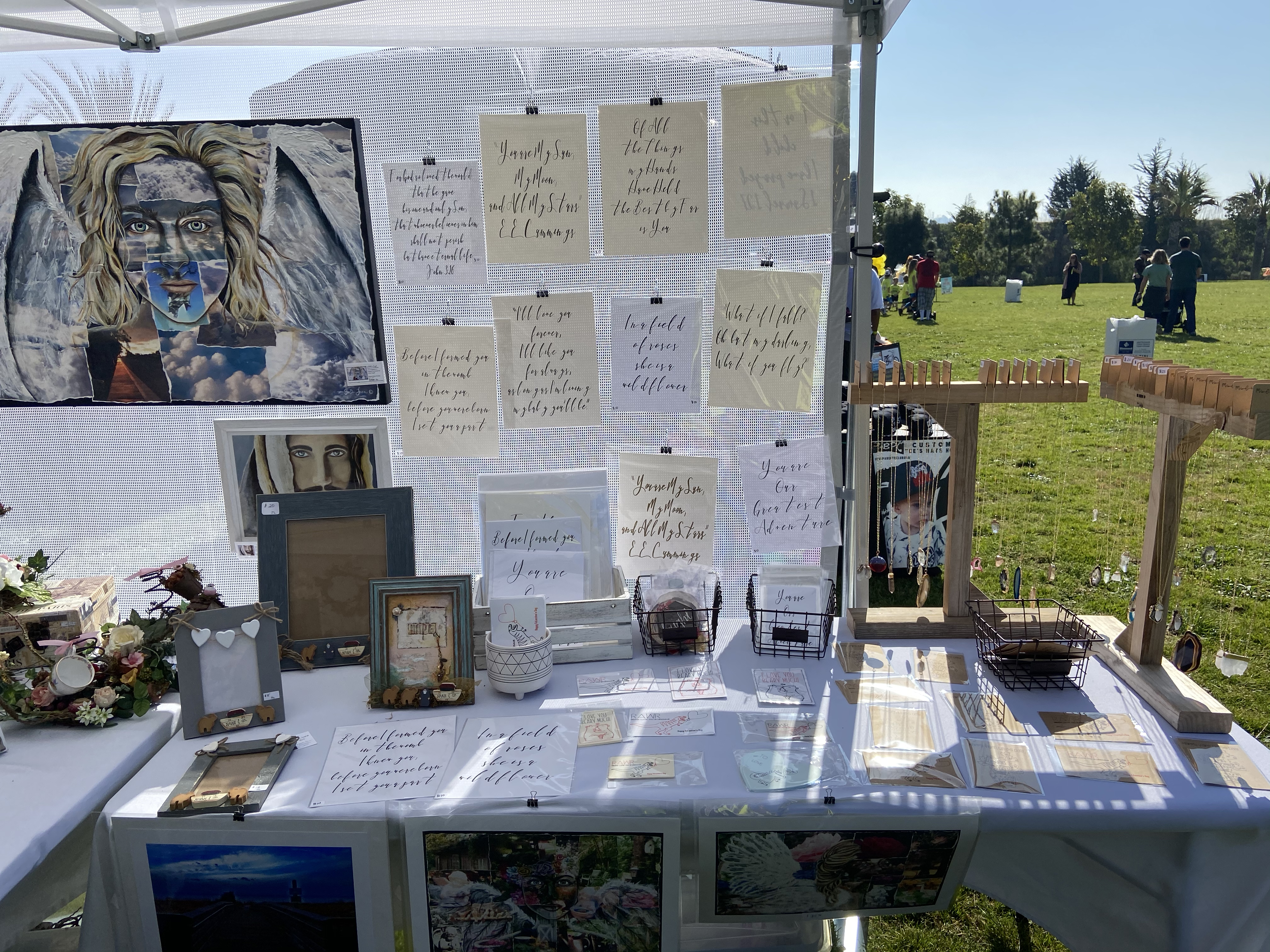 What a privilege it was to share a booth with Elya. She is a talented painter and the one who challenged me to try acrylic painting. Now she’s making jewelry and signs with script writing. The gallery below features Elya’s jewelry and scripting as well as my art, florals, and books.