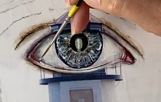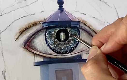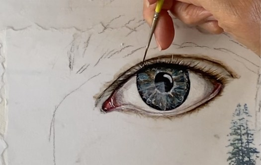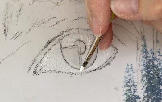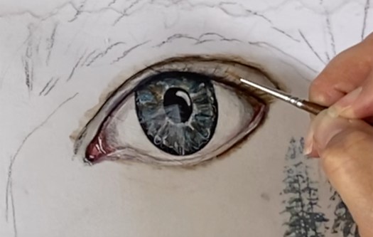 - Add white highlights to the iris and blur with a wet brush.