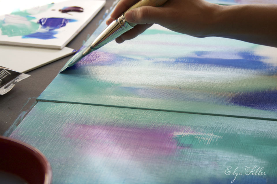 Begin by creating a muted background with various colors of acrylic paints: lavender, blue, and green.