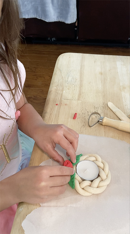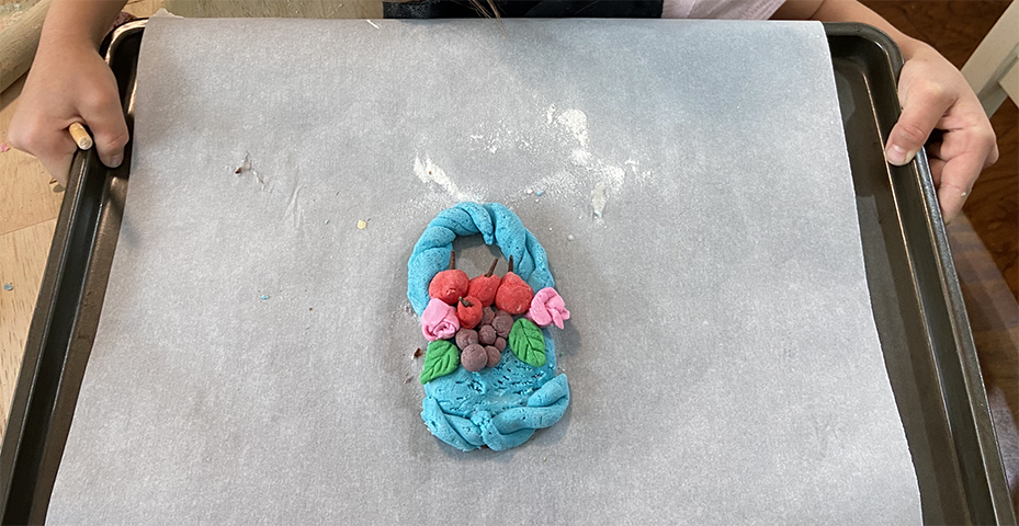 And she did. She chose her colors and crafted her own apple and rose basket. The only items she asked me to help her with were the leaves. Her tiny fingers rolled her own version of a rose. I have since adopted this new way in my own salt dough designs.