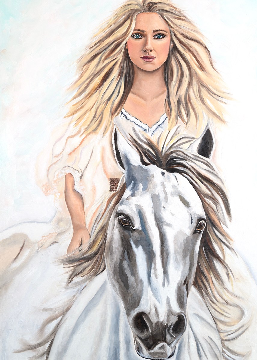 In this painting, a resolute woman sits astride a powerful white horse, her gaze fixed on the horizon. Clad in flowing garments reminiscent of pure white linen, she rides with strength and grace, embodying a spirit of unwavering faith. The ethereal background suggests a heavenly expanse, evoking the triumph of those who trust in their divine purpose. Through the interplay of light and texture, the painting captures the essence of resilience and divine empowerment.