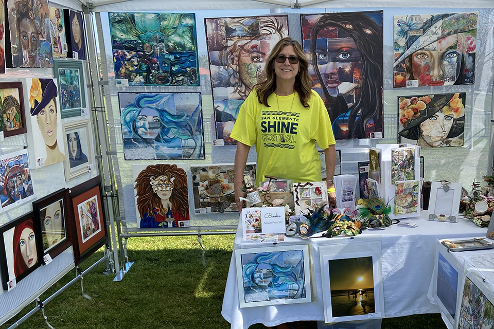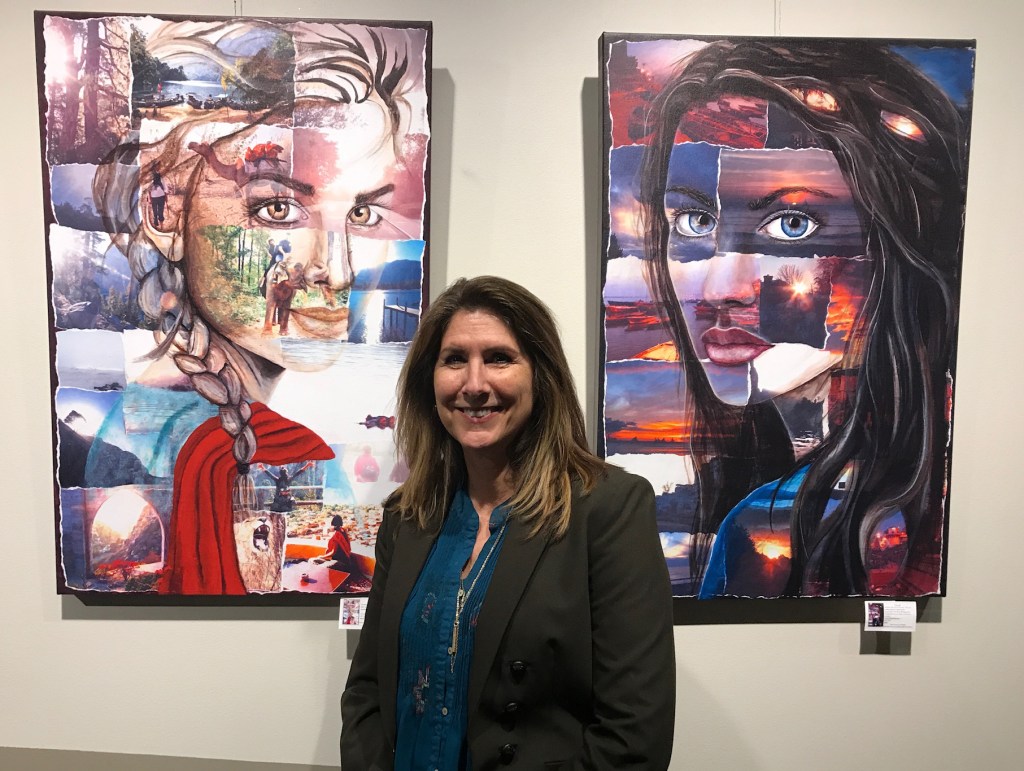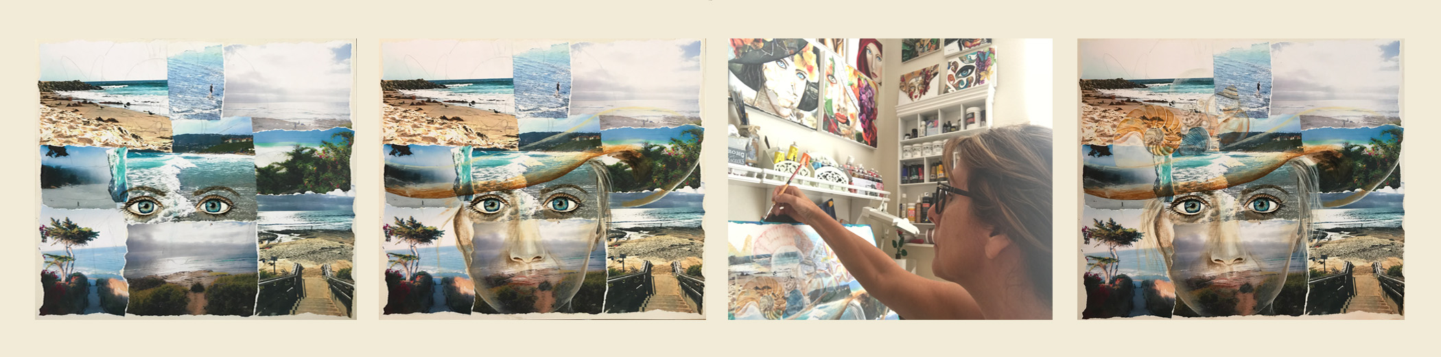 Inspiration comes with images I envision. Personal photography provides background photos. Sometimes the process reverses with a photo shoot resulting in an idea for a mixed media portrait. I use Golden gel medium to fix the photos onto the canvas for my mixed media portraits. Next, I sketch the image over the background and then paint with acrylics.