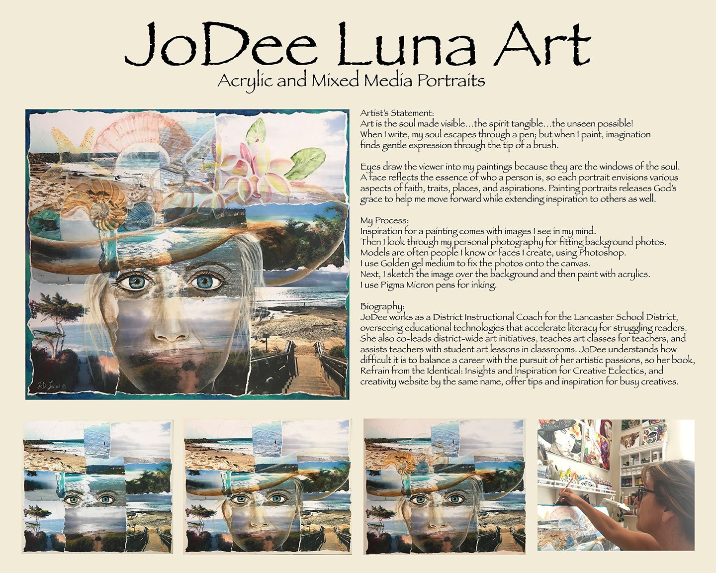 Hi, I’m JoDee Luna, an oil, mixed media, and acrylic portrait artist, author of  Refrain from the Identical: Insights and Inspiration for Creative Eclectics, and owner of JoDee Luna Art and Luna Arts & Ed, LLC.